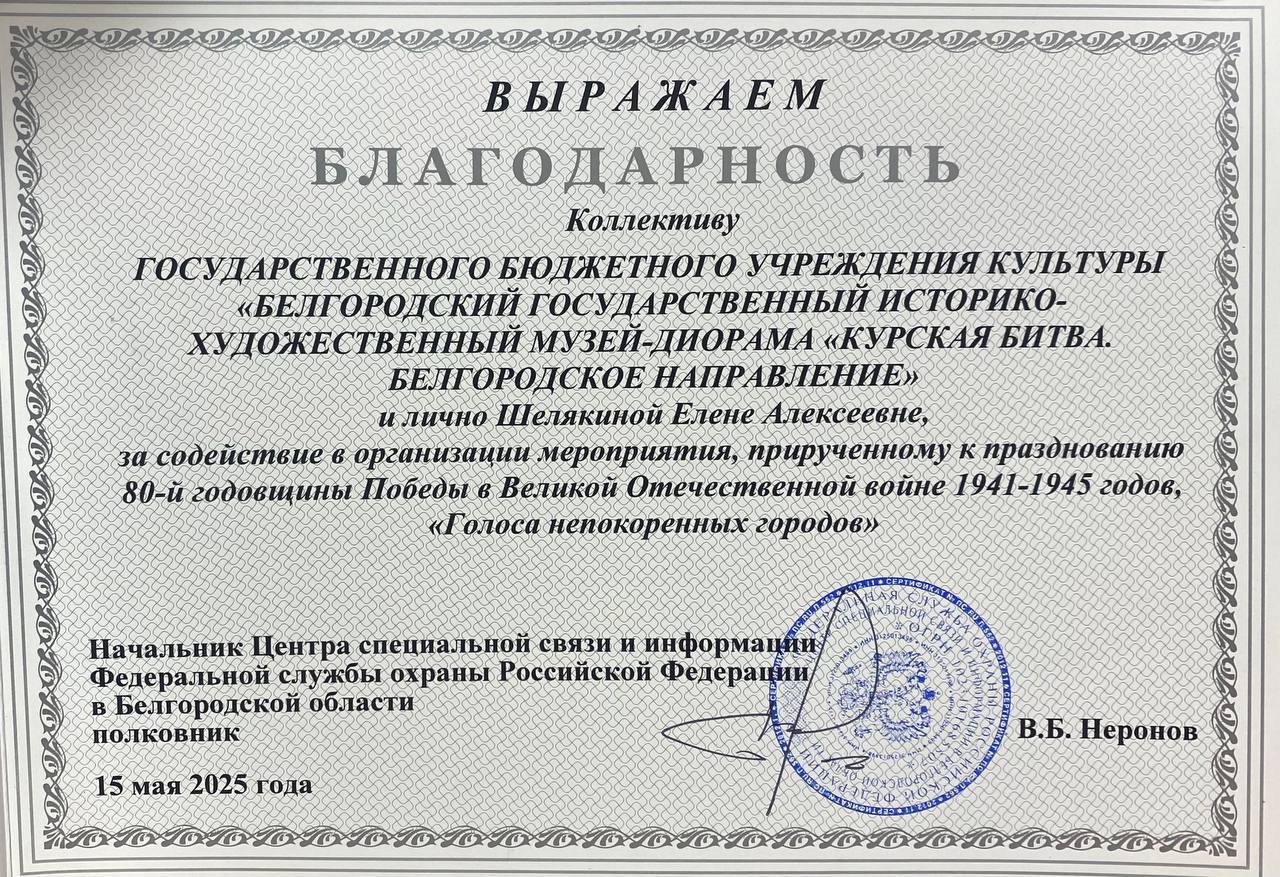 Благодарность коллективу музея от Федеральной службы охраны РФ