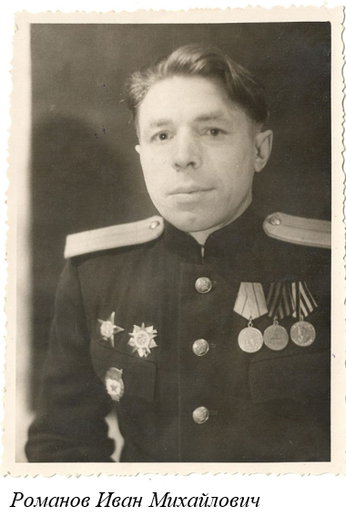 Романов Иван Михайлович родился 11 октября 1918 г. в Орловской области (д. Образцово, Корсаковский район). Участник Великой Отечественной войны 1941-1945 гг. Награжден Орденом Отечественной войны I степени, Орденом Красной Звезды, медалями «За оборону Ленинграда», «За взятие Кенигсберга», «За победу над Германией в Великой Отечественной войне 1941-1945 гг.».