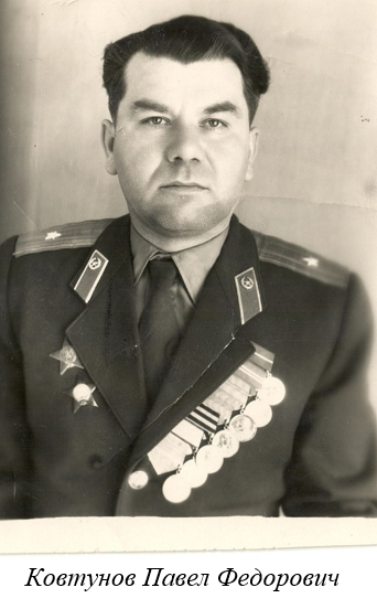 Ковтунов Павел Федорович (15.05.1922 г.р.) – участник Великой Отечественной войны 1941-1945 гг. С июля по сентябрь 1942 г. командир взвода автоматчиков в 1-м ударном отряде особого назначения Северо-Кавказского фронта. С 1944 по август 1945 гг. командир роты автоматчиков 32-го пехотного полка 8-й пехотной дивизии. С августа 1945 г. в составе 61-го отдельного полка резерва офицерского состава (г. Харьков).